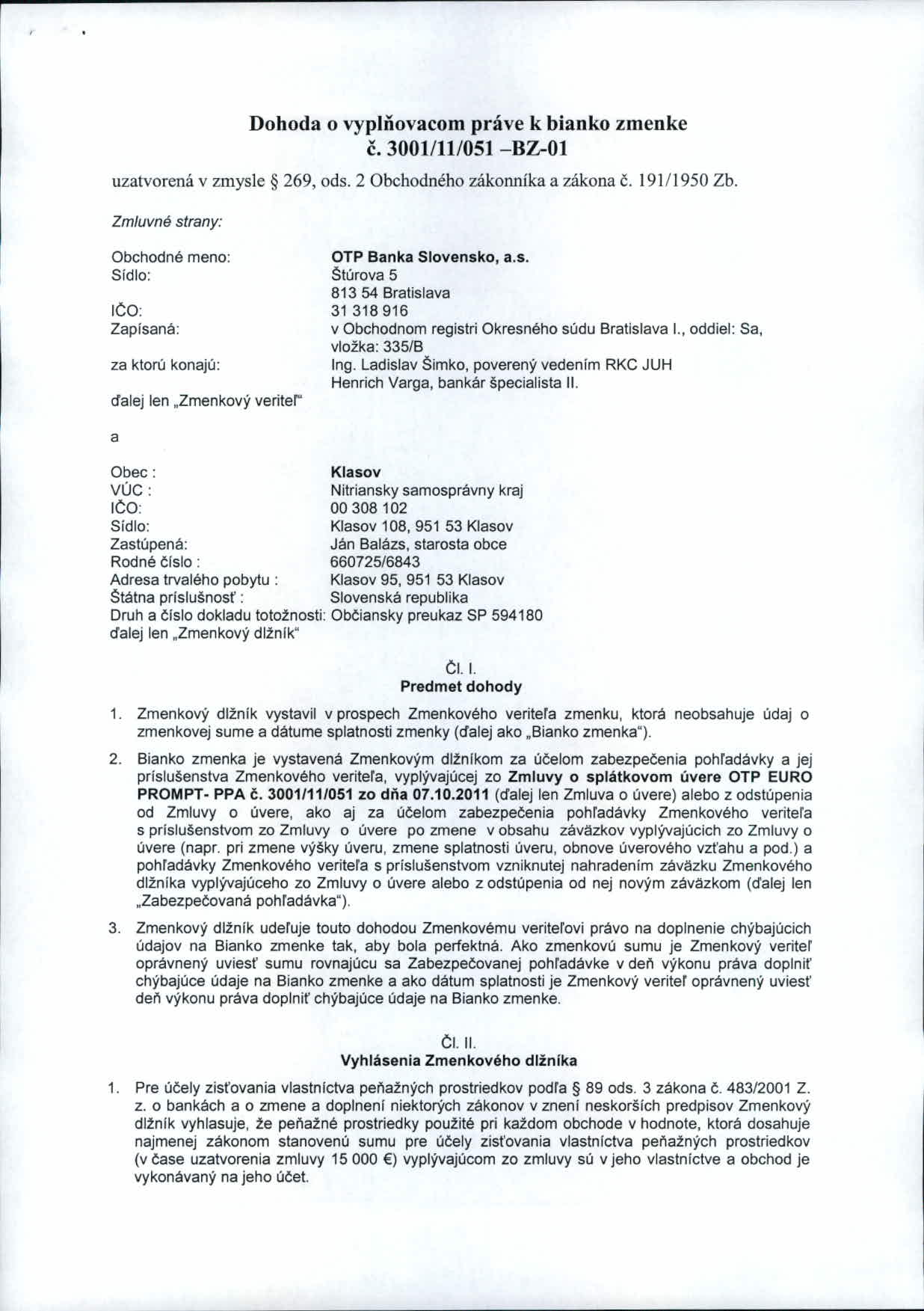 Zmluva: Dohoda o vyplňovacom práve k bianko zmenka